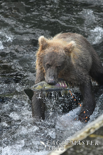 In this captivating photo, a sub-adult Kodiak brown bear is seen seizing a chum salmon hen, her eggs spilling into the water in a dramatic display nature's cycle. The powerful bear's instinctual hunt showcases the raw beauty and intensity of wildlife. This striking image was featured in the KMXT calendar as part of their photography contest, highlighting the breathtaking moments found on the Kodiak archipelago.