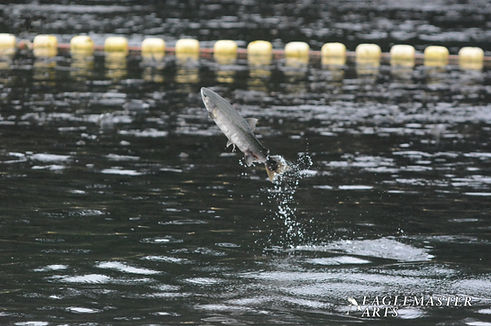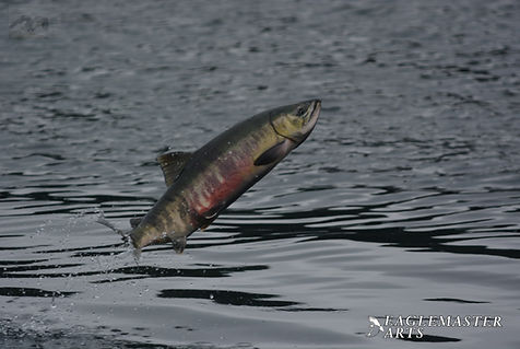 In this captivating photograph, a bright pink salmon leaps gracefully into the air, its body shimmering in the sunlight. The fish's wide eyes and slightly open mouth create an expression of surprise, as if it's taken aback by its own leap. This photograph was used in the Kodiak Regional Aquaculture Association’s annual report.